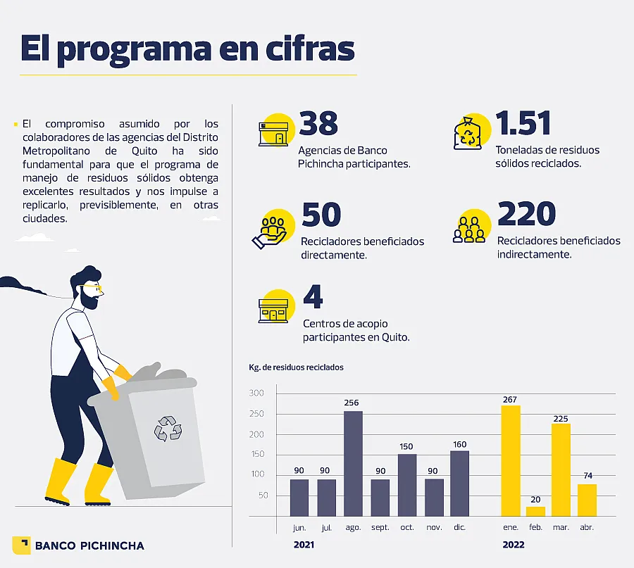 Desde mediados de 2021, Banco Pichincha colabora con la Empresa Pública Metropolitana de Gestión Integral de Residuos Sólidos (EMGIRS-EP) para implementar el Programa integral de manejo de residuos sólidos en nuestras agencias del Distrito Metropolitano de Quito. Esta iniciativa forma parte de nuestro Modelo de gestión sostenible que pronto irá de la mano, también, con la medición de la huella de carbono.