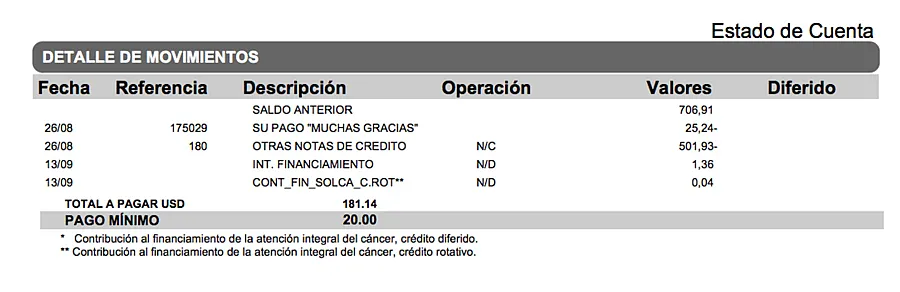 Para hacerlo, vamos a revisar el estado de cuenta de una tarjeta de crédito Visa Banco Pichincha, entre el período del 14 de agosto al 13 de septiembre. ¡Las fechas son importantes, así que tenlas en mente! Recuerda que este documento refleja la situación financiera de tu tarjeta (cupos, movimientos, consumos, pagos, cuotas, etc.) en un período específico.