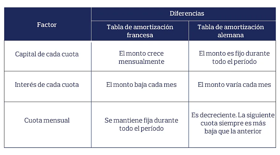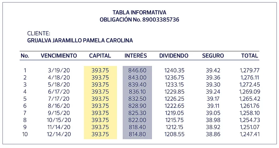 Entonces, la tabla de amortización es una herramienta informativa para el deudor, en la que se indica el número de cuota, la cuota mensual calculada según el sistema de amortización escogido, la fecha límite de pago, el número de cuotas totales, el capital más los intereses generados y el seguro contratado.